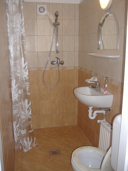 1 szobás (2 ágyas), főzősarok, zuhanyzó, wc, fedett terasz, az épület déli részén